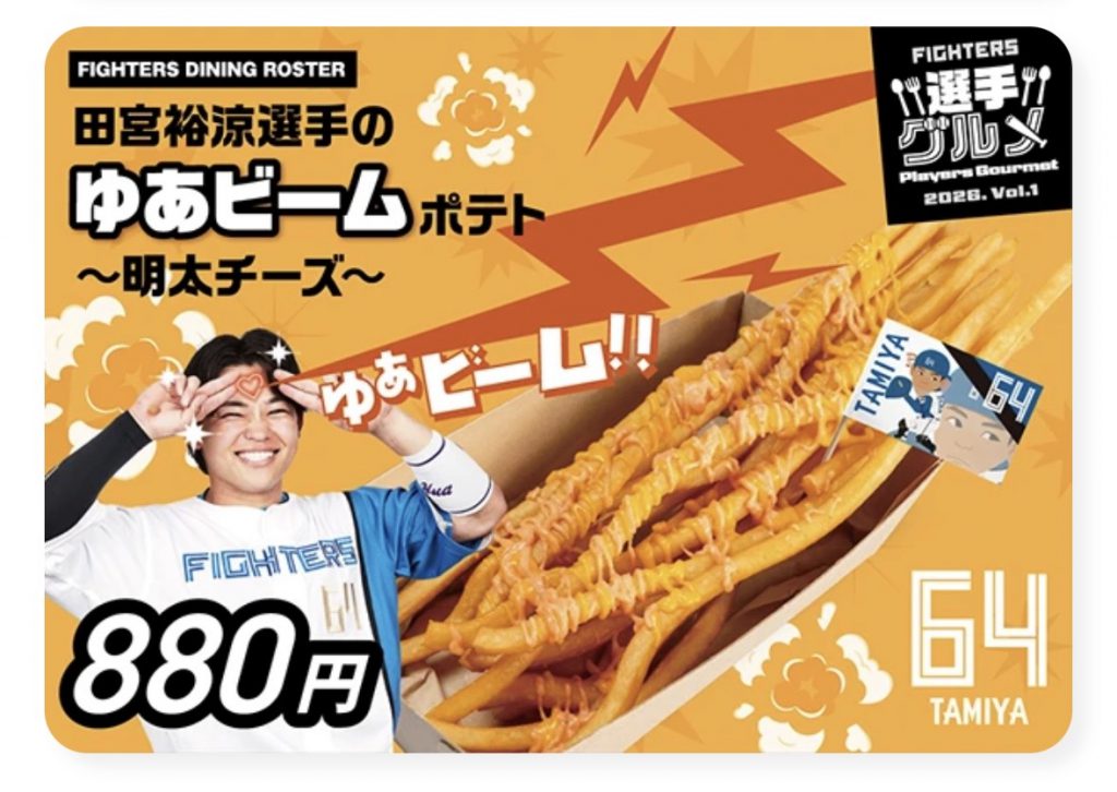 エスコンフィールドは食べ物のお店も充実してて、選手モチーフのフードもあって何を食べるか考える時間も楽しかったです。今回食べたのは田宮裕涼選手のゆあビームポテトです。選手の旗付きで嬉しかったです!他にも色々な施設やフードも盛りだくさんなので野球に興味のない方も楽しめると思います。是非行ってみてください!